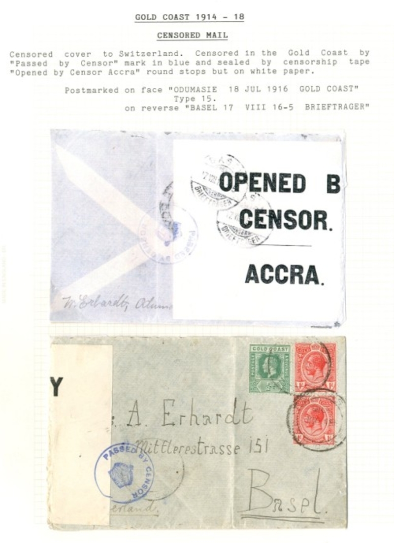 1916 (18 July) envelope to Switzerland, bearing KGV ½d. and 1d. (2) tied by "odumasie/gold coast" double-ring d.s. and showing "opened by/censor./accra." label (Type L4) tied by blue "passed by censor" h.s. (Type 2); the envelope with vertical crease near adhesives