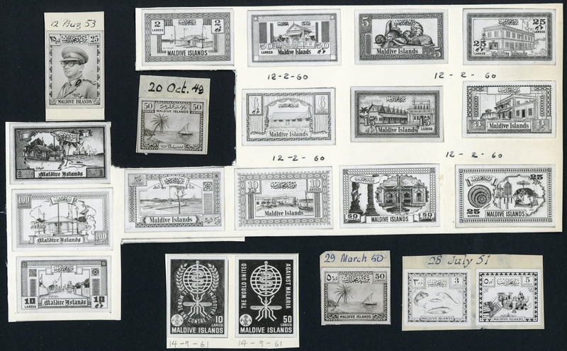 1949 (20 Oct.) 50c. unadopted design, 1950 (29 Mar.) 50l. similar to issued design, 1951 (28 July) 3l., 5l., similar to issued design, 1953 (12 Aug.) Sultan Mohamed Farid Didi 25l. unadopted design, 1955 (14 Mar.) 6l. (unadopted design), 1r., 1960 (12 Feb.) 2l. to 100r. set of fourteen unadopted designs, 1961 (14 Sept.) 10l., 50l., similar to issued design