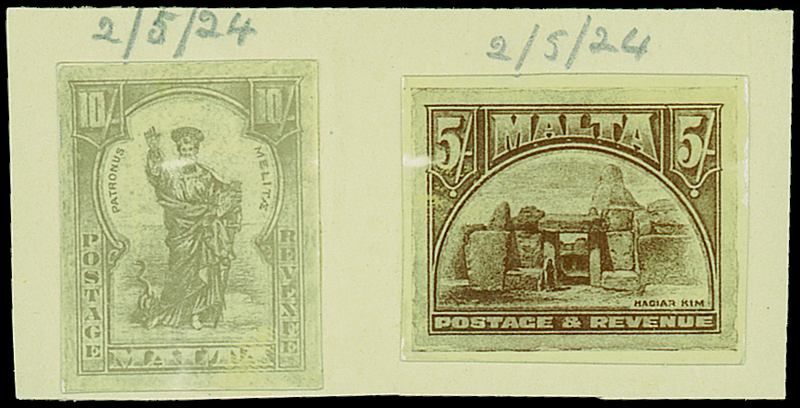 1924 (14 Apr.-12 May) ½d., 6d., 1/-, 5/-, 10/-, all unadopted designs; Postage Dues 1924 (22 Nov.-18 Dec.) 3d. (4, one similar to issued design) and Revenue (18 Dec.) ½d., 3d., £1, all unadopted designs. Photo
