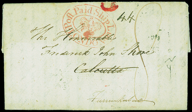 1819 (21 Aug.) entire letter from London to Calcutta, rated "8" and showing superb double-oval "paid ship lre/(Crown)/london"on the front, re-addressed on arrival and with a variety of transit markings on the reverse, fine. Photo