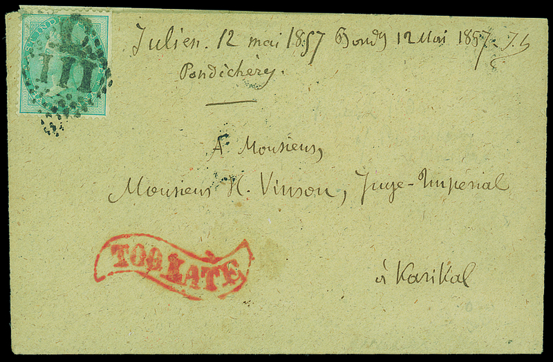 1857 (May) envelope from Pondicherry to Karrical bearing 1856-64 ½a. cancelled "C/111" and with red serpentine-framed "too late" handstamp, transit and arrival markings on reverse, fine. A scarce cover carried at the internal British Imperial postage rate. Photo