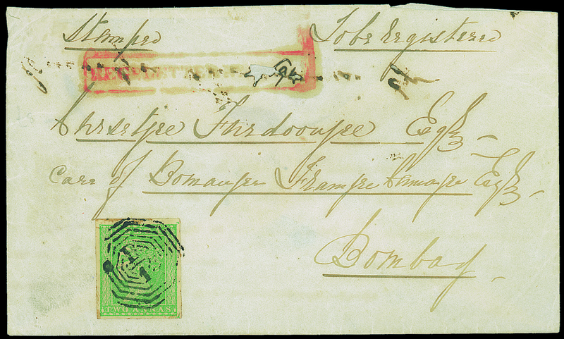 1857 (Aug.) envelope "To be registered" from Calcutta to Bombay, bearing 1854 2a. green with good to large margins and neatly cancelled "b/1", showing framed "registered no" in red (a little ink-etched) at top and, on reverse, two sender's cachets, despatch and arrival (20.8) c.d.s.; clean and attractive. B.P.A. Certificate (2013). Photo