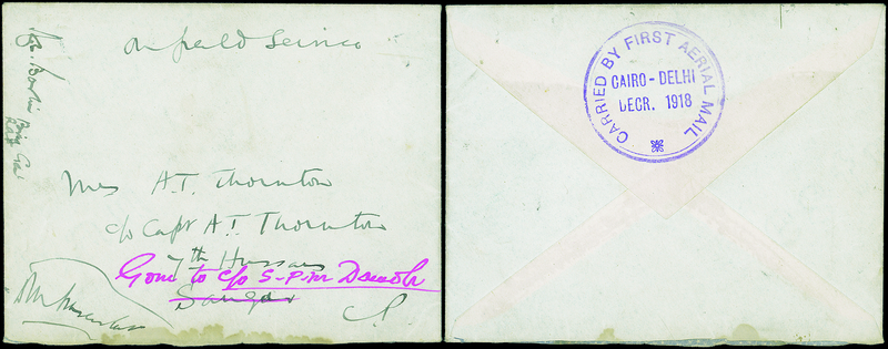 1918 (Dec.) stampless envelope On field Service to Sangar, redirected on arrival, on reverse superb violet "carried by first aerial mail/cairo-delhi/decr. 1918" cachet; small stain at foot though very fine and an extremely rare pioneer airmail cover. Only 30 carried. Photo