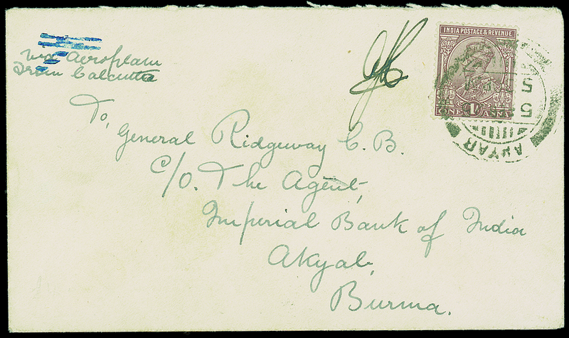 1925 (5 Feb.) Calcutta to Akyab flight by Cobham and Elliott, envelope bearing 1a. cancelled on arrival, initialled by Cobham and endorsed Via aeroplane/from Calcutta; fine and scarce. Photo