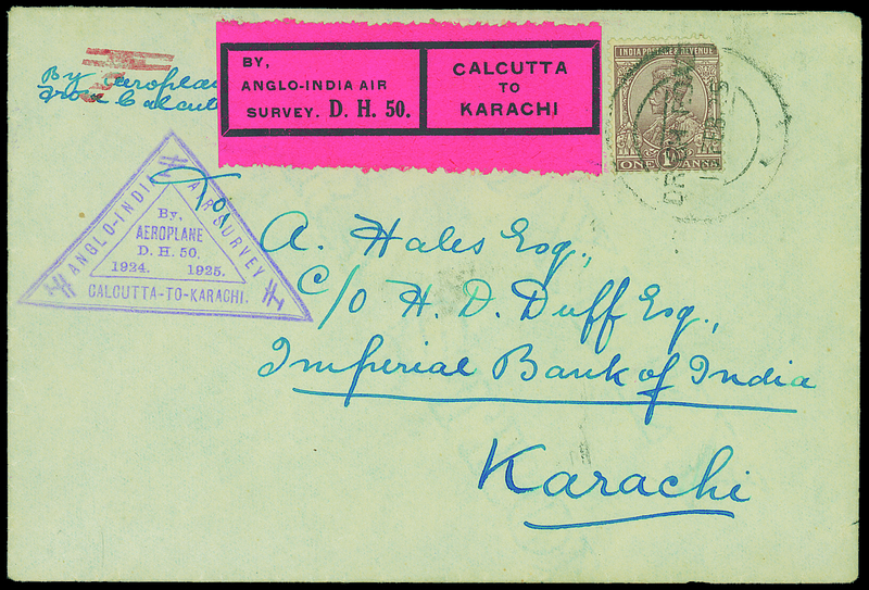 1925 (18 Feb.) Calcutta-Karachi flight by Cobham and Elliott, envelope bearing 1a. with black on magenta "by,/anglo-india air/survey. d.h.50" vignette alongside and triangular "anglo-india air survey" cachet, signed on the reverse by Arthur Elliott; a trifle soiled, otherwise fine. Only 100 carried. Photo