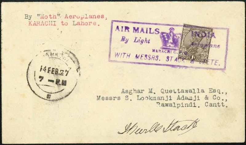 1927 (14 Feb.) Karachi-Lahore flight, envelope bearing 1a. with violet "AIR MAILS INDIA/By Light Aeroplane/ with messrs. stack and leete" cancellation, singed on the front by Stack; fine. Only 60 carried