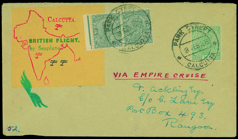 1928 (2 Feb.) envelope from Calcutta to Rangoon bearing 3p. pair and ½a. with Park Street c.d.s., special green and red on orange "british flight" vignette, Rangoon arrival c.d.s. (8.2) on reverse; fine. Ninety-two covers flown. Photo