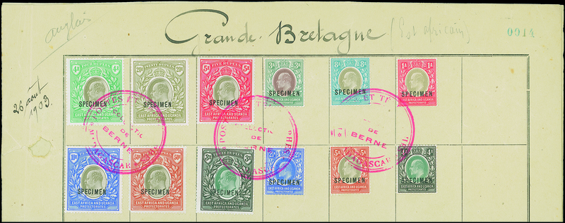 1a., 2½a., 3a., 4a., 5a., 3r., 4r., 10r., 20r. and 50r., each overprinted "specimen", neatly cancelled by "postes et telegraphes/collection/de/berne/madagascar" handstamp in red and affixed to piece signed by the Director of Posts & Telegraphs. A fine and unique item from the folio pages of the Madagascar Director of Posts archive. Photo