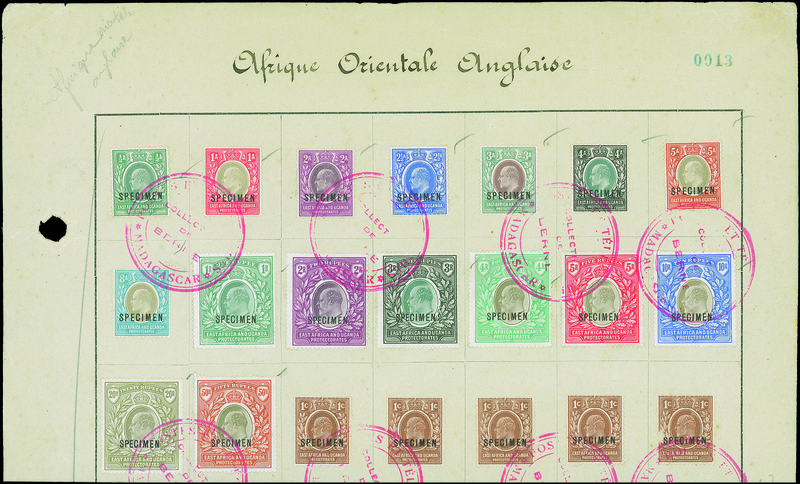 ½a. to 50r. set of sixteen together with 1907-08 1c. to 75c. set of nine (five examples of each), all overprinted "specimen", neatly cancelled by "postes et telegraphes/collection/de/berne/madagascar" handstamp in red and affixed to two pieces signed by the Director of Posts & Telegraphs; a few lower value stamps defective though a fine and unique item from the folio pages of the Madagascar Director of Posts archive. Photo