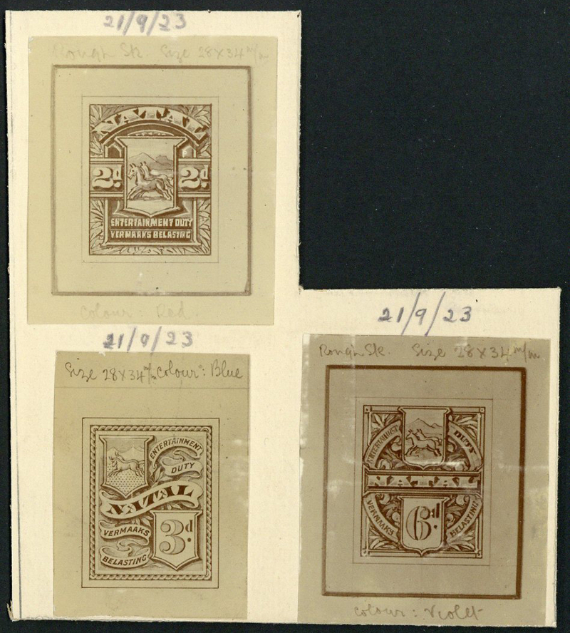 1923 (21 Sept.) Entertainment Duty 2d., 3d., 6d., unadopted designs