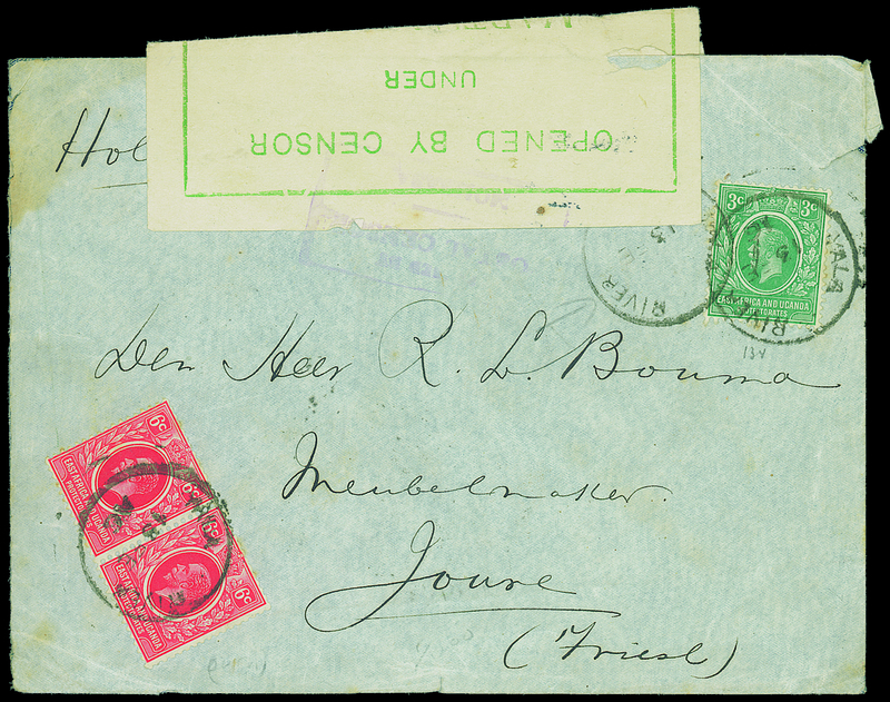 1916 (13 Feb.) envelope bearing 1912-21 3c., 6c. (2) with Yala River cancellations, sent from the Catholic Mission, Alwor, with green "opened by censor/under/martial law" label tied by a faint Postal Censor handstamp, on reverse Mombassa transit c.d.s. additionally tying the label; some small faults, scarce. Photo