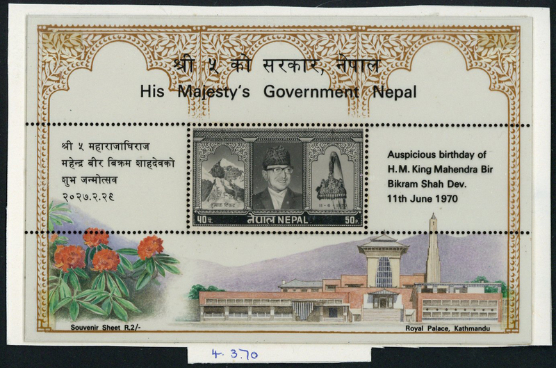 1965 (4 June) I.C.Y. 15p. unadopted design, 1970 (24 Feb.) King Mahendra's 51st Birthday 50p. (2, one affixed to composite unadopted miniature sheet with parts hand-painted)