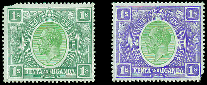 1/- (2) on gummed watermarked paper, both with vignette in yellow-green, the frames in grey and in bright violet; both with one corner defective though attractive and very rare. Photo