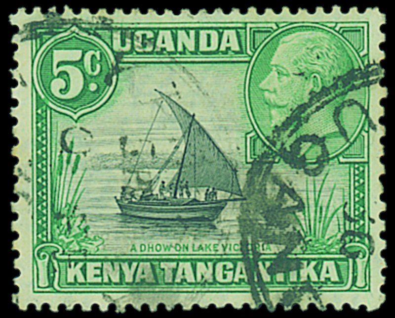 1935 5c. black and green, perf. 13x12, used with two part Uganda c.d.s.; sound. Scarce. S.G. 111b, £850. Photo