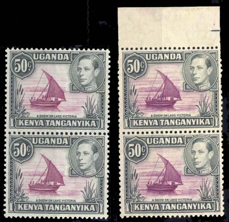 — 50c. perf. 13x11½ vertical marginal pair, the lower stamp showing rope not joined to sail, mint with the usual toned gum, normal with some short perfs., and 50c. perf. 13x12½ vertical pair, one with dot removed, fresh unmounted mint. S.G. 144a, 144eb, £800