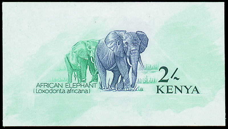 1963 (c.) 2/- African Elephant essay die proof in blue-green, violet and blackish green on glazed gummed paper (66mm x 37mm). Superb. Photo