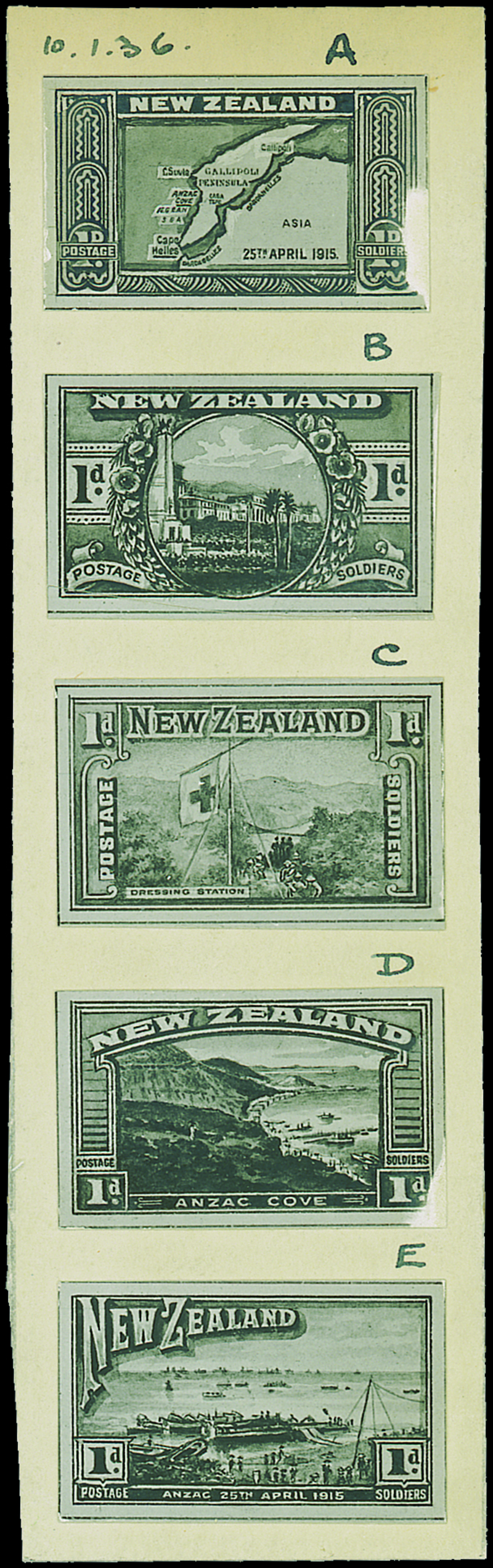 1926 (19 Apr.) 1d. unadopted design, 1935 Silver Jubilee undenominated value, 1936 (10 Jan.) Charity (21st Anniversary of "Anzac" Landing at Gallipoli) 1d., five different unadopted designs. Superb. Photo