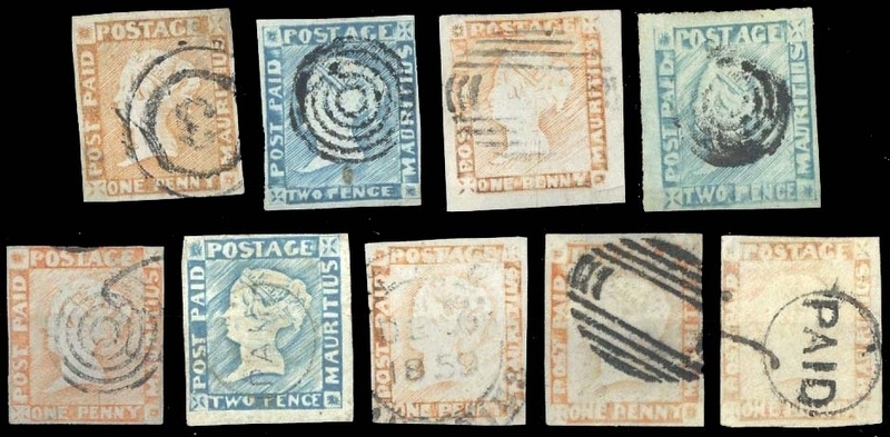 1848-59 "post paid", early worn impression 1d. and 2d., later worn impression 1d. (2) and 2d. (2, one cleaned and with forged "paid" handstamp), and latest impression 1d. (3, one with c.d.s.), nearly all with four margins; some faults though mostly of good to fine appearance