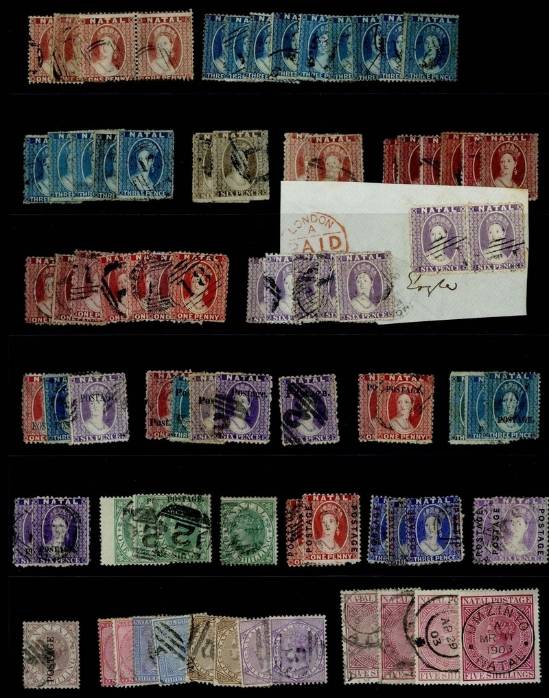 1859-95 used collection, including 1859-60 1d. (4) and 3d. (8), 1861-62 3d. (5) and 6d. (2), 1862 1d. (2), 1863 1d. (6), 1863-65 1d. (7) and 6d. (7 with a pair on piece), 1869 Postage Type 7a 1d., 3d. and 6d., Type 7b 1d., 3d. and 6d. (2), Type 7d 6d., and Type 7e 1d. (2), 3d. (3), 6d. (2) and 1/- (3), 1870-73 1d. (2), 3d. (3) and 6d. (2), 1873 1/-, 1874-99 selection with 5/- (10, shades with a block of four and one with superb Umzinto c.d.s.), 1875-76 Type 17 1d. (2) and Type 18 1d. yellow (3) and 6d. (4), 1877 ½d. on 1d. (3) and a selection of later values; a few small faults in places though generally good to fine