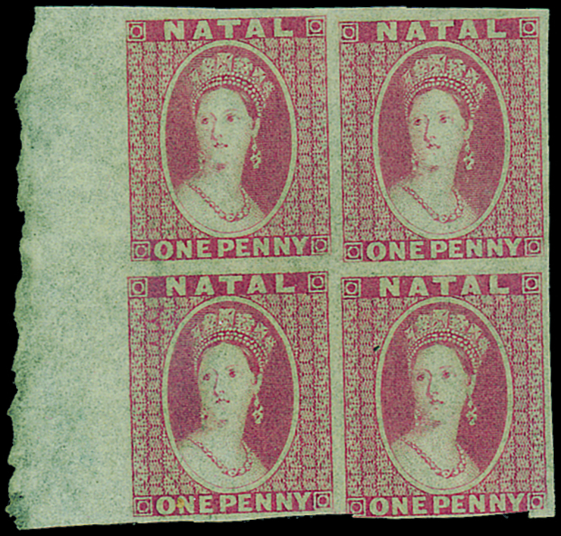 1859-60 1d. rose-red imperforate plate proof on unwatermarked gummed paper, a marginal block of four from the left of the sheet; one stamp touched at foot, otherwise fine. Photo