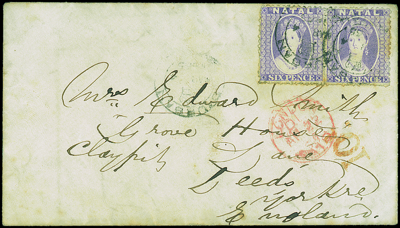 1865 (4 Mar.) envelope from Durban to Leeds, bearing 1863-65 6d. lilac pair each cancelled with double-ring datestamp and showing, below, rare "10d" Postage Paid Accountancy handstamp in red (Hart T.4.2.) alongside London Paid transit c.d.s. (22.4) and arrival c.d.s. (22.4) on reverse; a little soiled though scarce and unusual. Photo