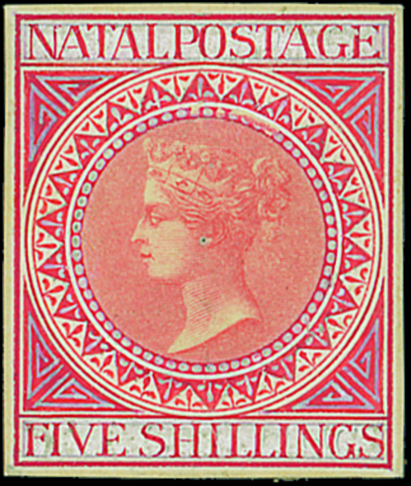 5/- composite essay in close to the issued design, stamp-size on card initialled "AMD" on reverse, the head and background printed, the remainder of the design handpainted in shades of red with background to the lettering and other portions of the design completed in Chinese white. Unique and highly attractive. Photo