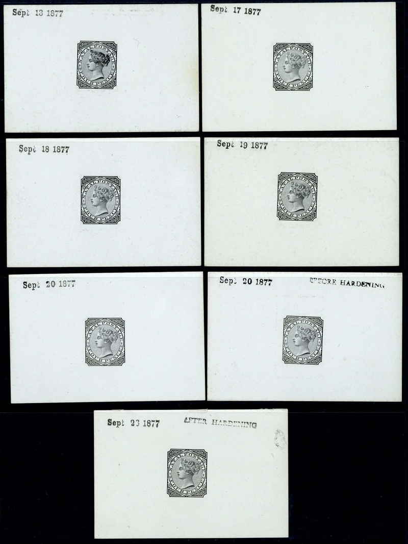 4d. group of eight in black showing a lessening of colour intensity due to cleaning up of the die over a period, each on glazed card (92x60mm.), dated 12, 13, 17, 18, 19, 20 (2) and 23 September 1877 with the last two marked "after hardening". A fine and rare group. Photo