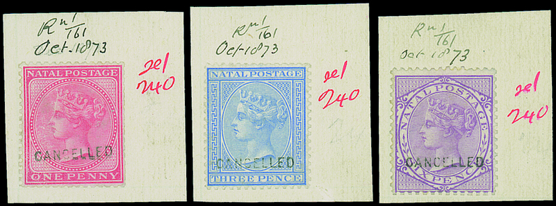 1d. rose, 3d. blue and 6d. lilac, each handstamped "cancelled" (D4) and affixed to De La Rue day book pieces dated "Oct 1873". A unique trio. Photo