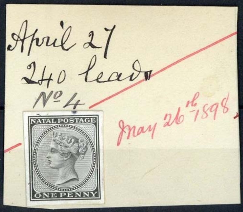 1d. in black, stamp-size on glazed card and affixed to De La Rue day book piece with details of leads taken, subsequently dated "May 26th. 1898" in red ink; fine