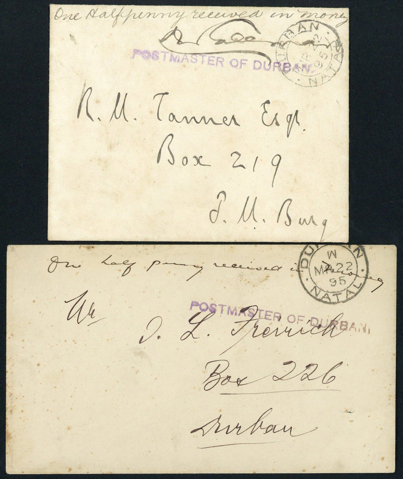 1895 (Mar.) Coleman envelopes (6) from Durban addressed locally (5) or to Pietermaritzburg, all endorsed "One half penny received in money", signed by J.W. Coleman, the Postmaster, and with Durban despatch c.d.s.; one with faults otherwise good to fine