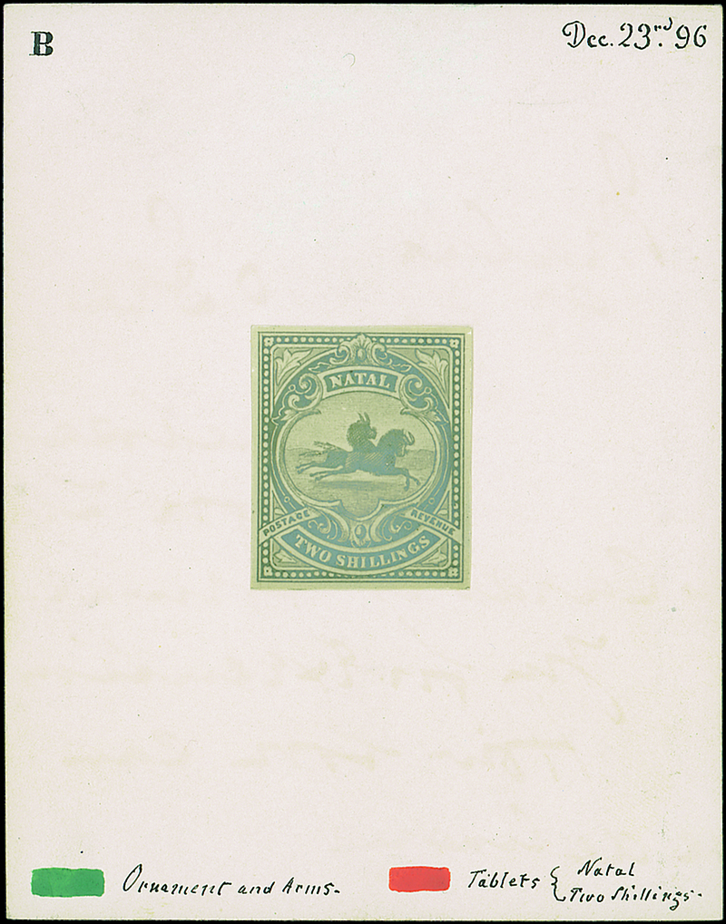 2/- photographic essay showing two Wildebeest in central oval, affixed to card (89x114mm.) with colour patch in green marked "Ornament and Arms." and in red marked "Tablets Natal Two Shillings.", lettered "B" and dated "Dec. 23rd, 96". Photo