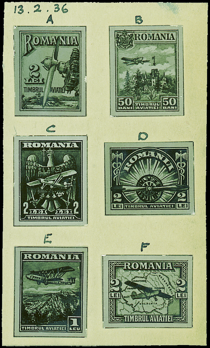 1905 (22 Dec.) 25th Anniversary of the Kingdom 25b. similar to issued design, 1905 (22 Dec.)-1906 (8 May) 1b. to 2l. set of ten with additional 3b., 15b. (4), 1l., mostly unadopted designs, 1906 (30 Jan.) Welfare Fund undenominated unadopted design, (6 June) Jubilee Exhibition, Bucharest 3b., 5b. (2) unadopted designs, 1930 (23 Dec.)-31 (27 Jan) 100l., 130l., 1933 (31 Oct.)-1936 (13 Feb.) Postal Tax. Aviation Fund 50b. (8), 1l. (9), 2l. (11), all different unadopted designs; also Charity 1906 (8 Mar.) 15b. (2). A wonderful group. Photo