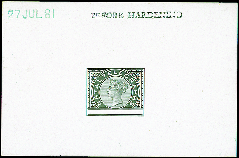 1881 New Colonial Die B small head with circular lined background and uncleared surrounds, in black on glazed card (92x60mm.) marked "Colonial", "before hardening" in red and dated "17 jun 81". Photo