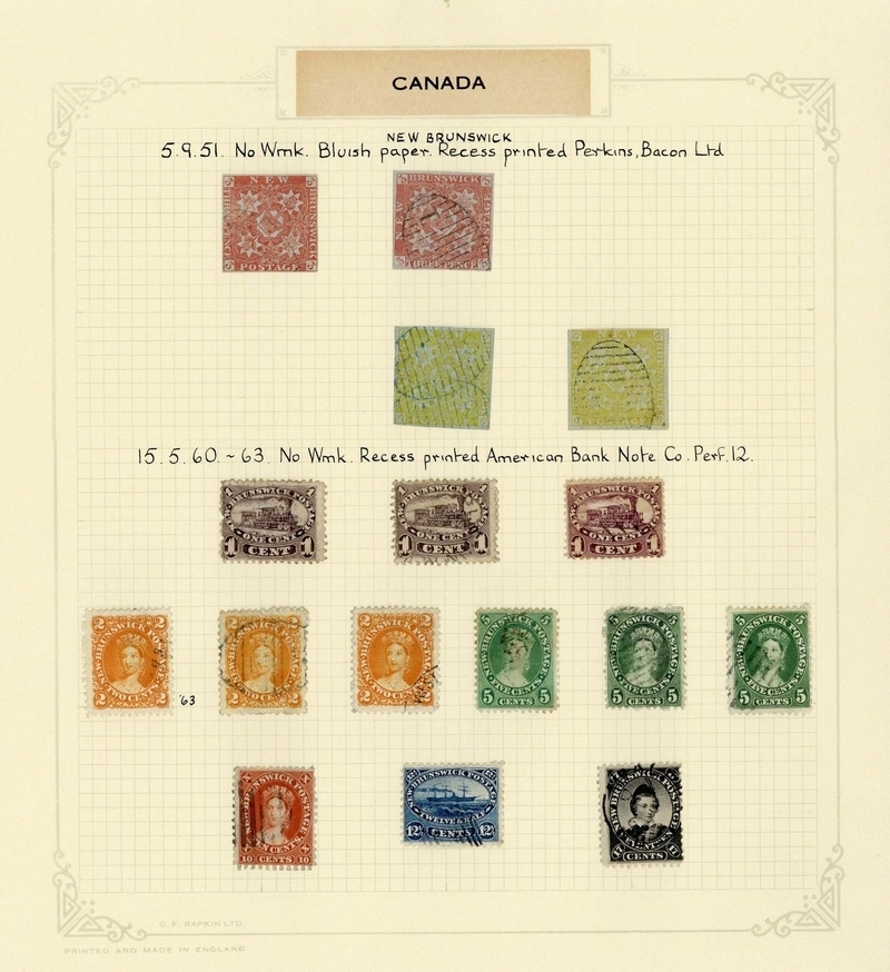 1851-60 3d. (2) and 6d. (2, one twice cancelled "8" in blue), all with four margins; 1860-63 1c. (3), 2c. (3), 5c. (3, two sap green), 10c., 12½c. and 17c., used; a couple of the imperfs. with small imperfections, otherwise generally good to fine