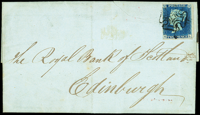 Plate 1, EJ in a dark blue shade, close to enormous margins on entire to Edinburgh, just tied by a neat strike of the distinctive Greenock Maltese Cross in black; two vertical folding creases, one through the adhesive; nevertheless and good and appealing cover. R.P.S Certificate (1972). S.G. Spec. D1va, £7500. Photo