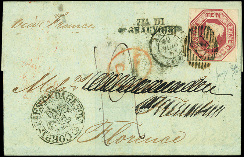 10d. brown, die 2, close to large margins and well tied on 1851 (18 Aug.) wrapper to Florence, "via France", tied by London District "14" numeral of Leyton with "PF" in oval, "via di/beauvoisi" and circular "corriso a est a da genoa", the reverse with Charing Cross despatch and arrival datestamp. Part of the address has been inked over. An attractive and appealing cover. Holcombe Certificate (1999). Photo