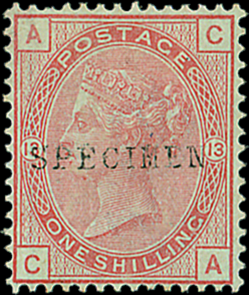 — 1/- orange-brown, plate 13, CA overprinted "specimen" type 9, part original gum with some wrinkling. S.G. Spec J115s, £550. Photo