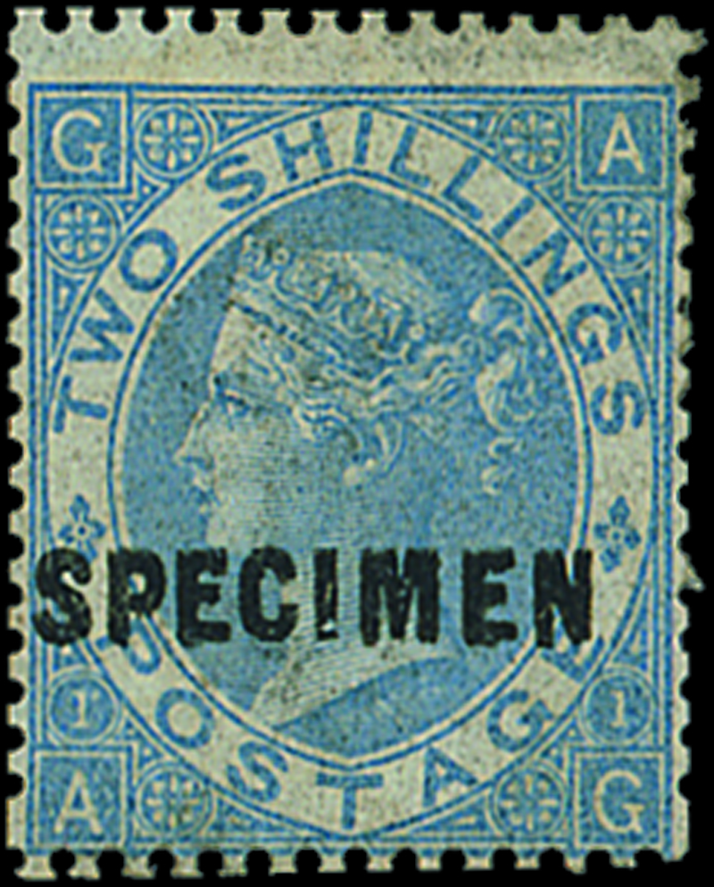 — 2/- blue, AG, overprinted "specimen" type 5, with some gum; centred low, light ageing. S.G. Spec. J118u, £600. Photo