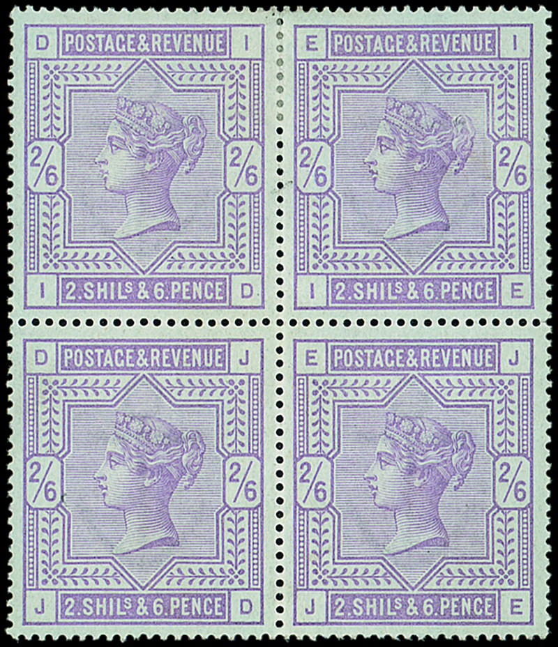 1883-84 2/6d/ lilac, ID-JE block of four, large part original gum being lightly mounted with small hinge remainder; fresh and attractive. B.P.A. Certificate (1997). S.G. 178. Photo