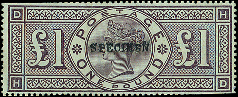 1884 Watermark Crowns, £1 brown-lilac, HD overprinted "specimen" type 9, with traces of gum; clipped perfs. in corners and vertical wrinkle, superb colour. S.G. Spec. K15t, £2800. Photo
