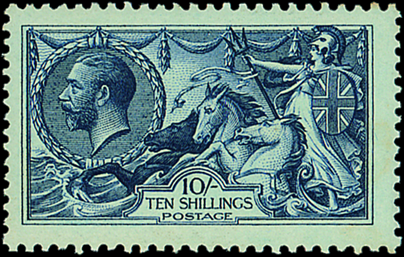 1913 Seahorse, Waterlow 10/- indigo-blue, lightly mounted mint; centred fractionally left. A fresh and fine example of this stamp. S.G. 402, £950. Photo