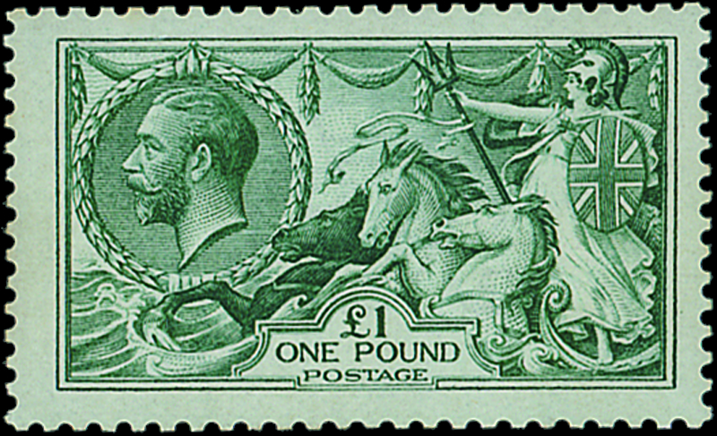 — £1 dull blue-green, part original gum; improved perforations at top; fresh. S.G. 403, £3000. Photo