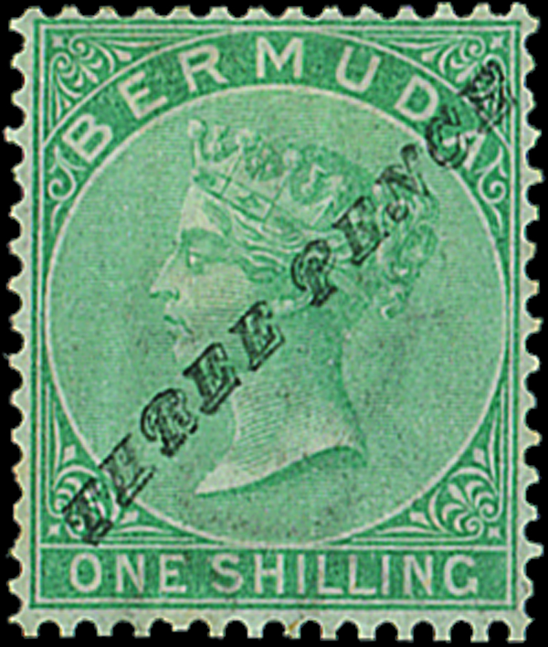 1874 "three pence" (Type 6a) on 1/- green, fine unused with large part original gum. S.G. 13b, £2000. Photo