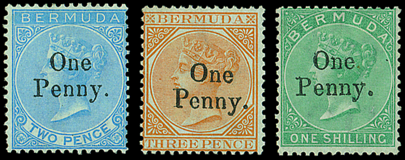 1875 (March - May) "One/Penny." on 2d. dull blue, "One/Penny." on 3d. yellow-buff and "One/Penny." on 1/- green, all unused with large part or part (3d.) original gum, fine. S.G. 15-17, £1650. Photo