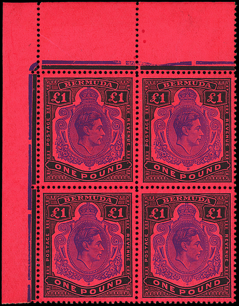 — £1 bright violet and black on scarlet, a top left corner block of four, [1-2/13-14], fresh and fine, mounted in the selvedge only. S.G. 121e, £720. Photo