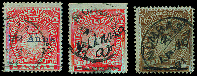 1891 Mombasa provisionals, "½ Anna" handstamped on 2a. vermilion and initialled "A.D.", "½ Anna" in manuscript on 2a. vermilion initialled "A.B.", and "1 anna" in manuscript on 4a. brown initialled "A.B.", each with part Mombasa c.d.s., fine. S.G. 20, 23, 26; £3600. Photo