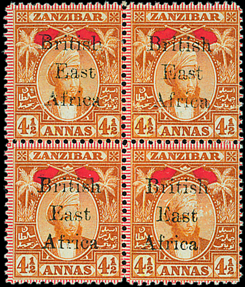 1897 (Jan.) 4½a. orange and red block of four, unused with large part original gum, fresh and fine. A rare multiple, a block of four being the largest recorded by John Minns. S.G. 83, £240. Photo