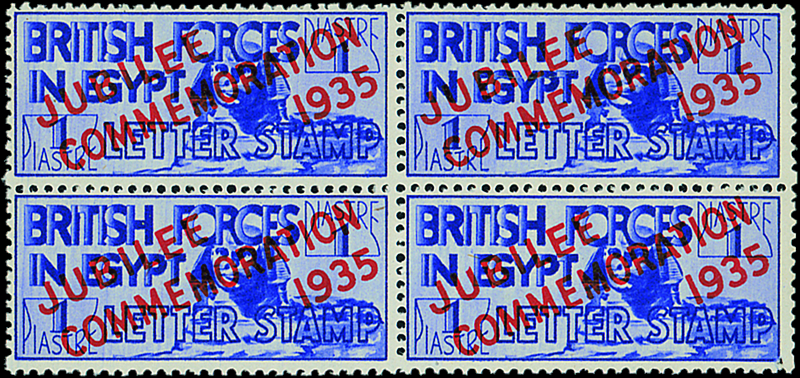 1935 Silver Jubilee 1p. ultramarine block of four, the lower right stamp showing variety short "u", the lower right stamp with usual pinhole at lower right corner, fine mint. S.G. A10, £1100. Photo