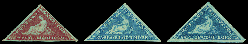 1853 paper deeply blued 1d. pale brick-red with clear to good margins, 4d. blue with small to large margins and paper slightly blued 4d. deep blue with large margins, all unused and regummed. S.G. 1, 2, 4. Photo