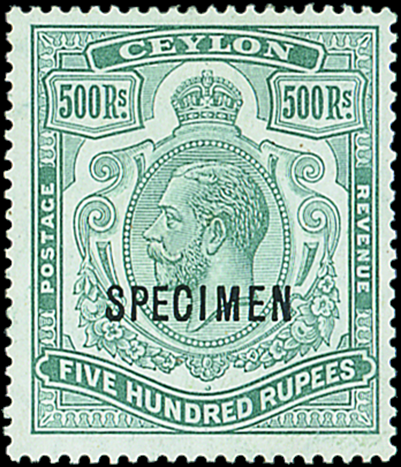 — 500r. dull green overprinted "specimen" (Type D12), lightly hinged, fresh and very fine. S.G. 322s, £600. Photo
